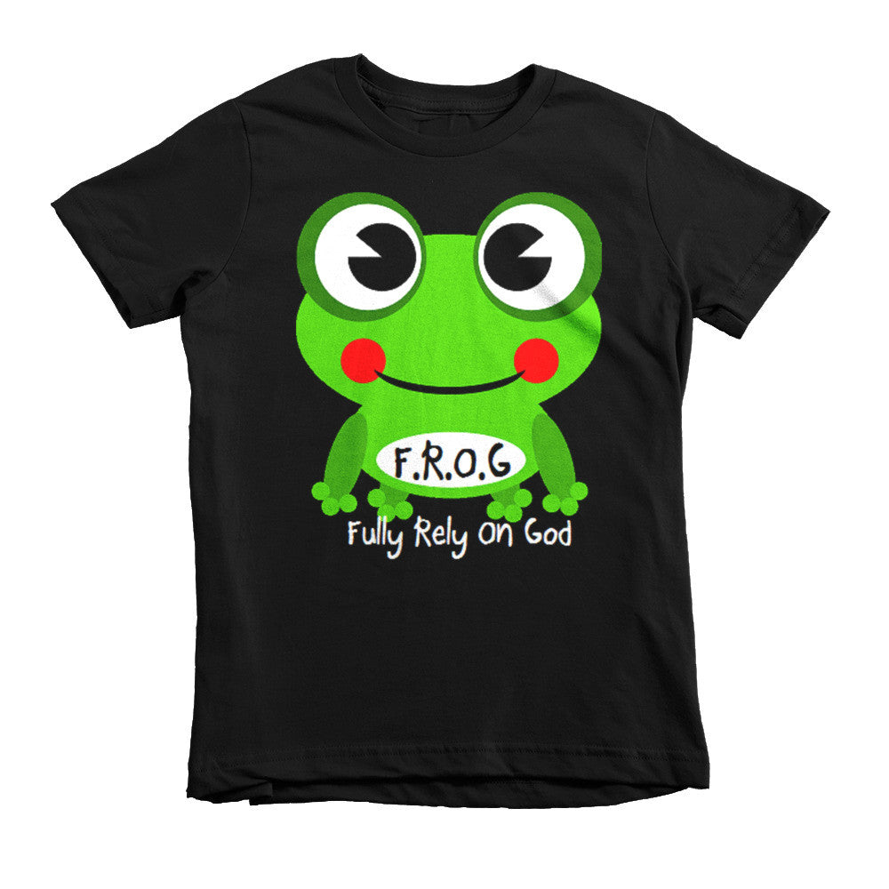 This short-sleeve Fully Rely On God Frog baby onesie is soft, comfortable, and made of 100% cotton. It's designed to fit infants of all sizes, with a rib knit to give good stretch and a neckband for easy on-and-off. It is black with a green frog on it and says, "Fully Rely On God"