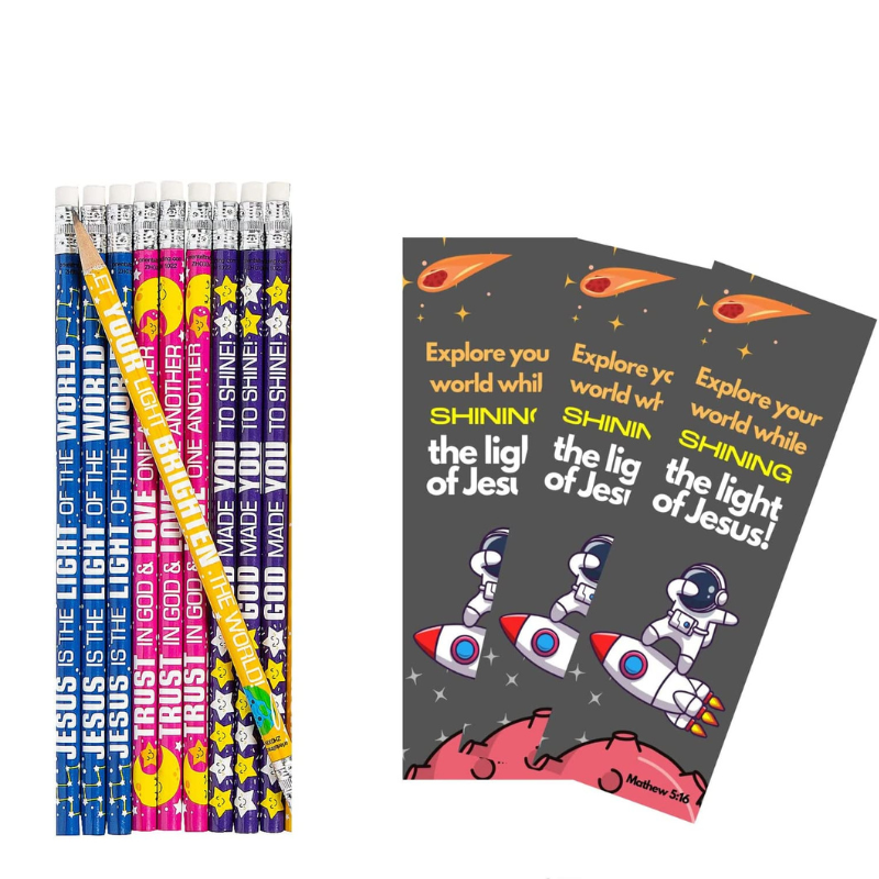 - 72 Bible inspired bookmarks for kids. There are 6 different designs. The heavens declare the glory of God. Trust in the Lord forever, for the Lord Himself is the rock eternal. We love Him because He first loved us. Anyone who is in Christ is a new creation. Jesus is the light of the world. The Lord is my shepherd. You can use these for the children at your church. The front is colorful and fun. These are 6" in size. The back is blank and all white. The thickness is just right. The front is glossy and smooth, and the back feels and looks just like paper. All the bookmarks come with nice ribbons. These are so cute. These Christian bookmarks for kids are great to accompany candy treats. Decorative bookmarks feature a variety of designs and quotes for religious events. Use in Bible study or at school for students' encouraging and inspiration to learn and implement verses. They make great gifts for students. Use these as gifts to children when they check out library books at church. Give these bookmarks to family and friends for birthday favors. Great variety for vacation Bible school.