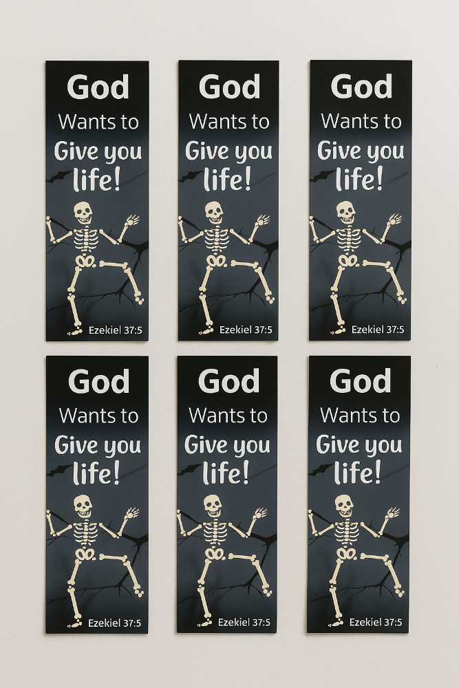 Share the message of God’s love this fall with our 100 Bulk Christian Halloween Scripture Bookmarks featuring Ezekiel 37:5: “This is what the Sovereign Lord says to these bones: I will make breath enter you, and you will come to life.” Each bookmark reminds people that God wants to give them life and is a meaningful alternative to traditional Halloween handouts.